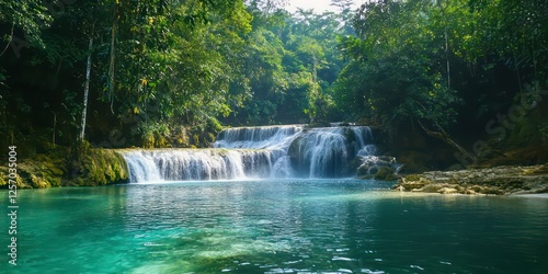 A hidden tropical waterfall with a crystal-clear pool below.
