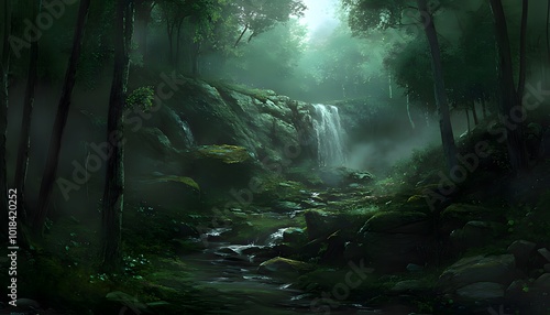 A hidden waterfall cascades down a mossy rock face, nestled deep within a lush, verdant forest