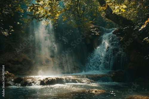 A hidden waterfall in a dense forest, sunlight filtering through the trees and illuminating the water