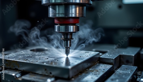 A high precision CNC milling machine expertly shaping a block of raw metal. Coolant sprays precisely onto the cutting area, highlighting the intricate detail being achieved by the multi axis tool