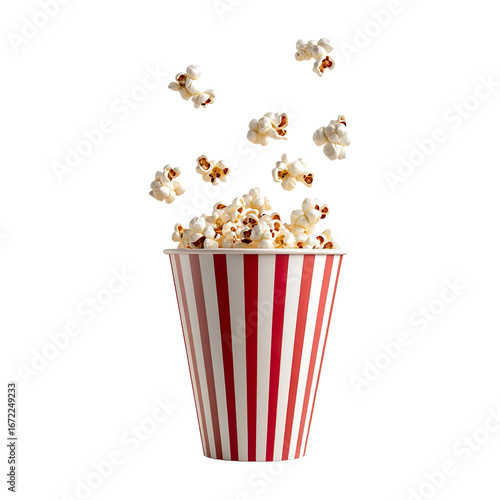 A high resolution, widescreen of popcorn flying out of a red and white striped popcorn cup isolated on transparent background