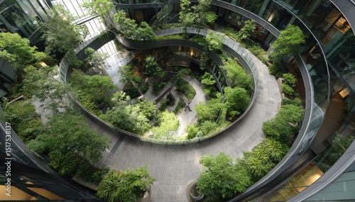 A high-angle, bird's-eye view of a spiraling, multi-level atrium garden within a modern building. The design incorporates walkways winding through lush greenery, creating a unique indoor oasis