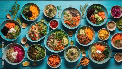 A high-angle, full shot of various healthy food bowls and plates arranged on a teal wooden table.