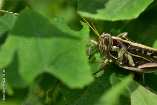 A high-angle macro view of a brown and yellow grasshopper resting among lush green foliage in its natural environment.