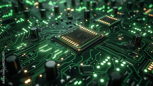 A highangle shot of a green circuit board with white electrical paths, symbolizing clean technology