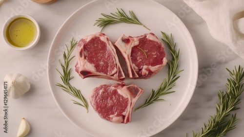A high-angle shot of raw lamb chops arranged on a clean white plate, with rosemary sprigs and garlic cloves adding a touch of natural decoration