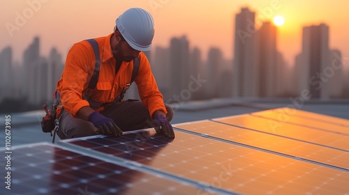 A high-angle view of a solar installation technician working atop a building with a panoramic view of an urban skyline. The technician is meticulously aligning the panels under the glaring sun,