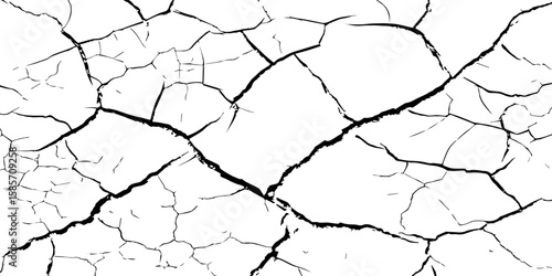 "A high-contrast, black and white close-up of a cracked surface, resembling dry earth or old paint, with irregular polygonal segments and fine lines spreading across the frame."