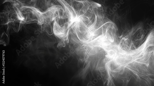 A high-contrast black and white smoky background with silver-like mist swirling in soft, elegant patterns
