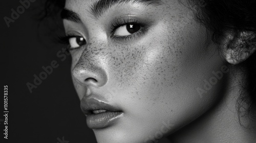 A high-contrast black-and-white close-up of a mixed-heritage Asian woman a s face, focusing on the texture of her skin and the depth of her expression, giving a timeless and artistic feel