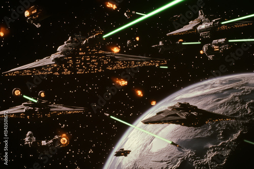 A high-energy 3D background of an intergalactic battle taking place above a distant planet. Spaceships engage in a dazzling display of laser combat, while massive warships exchange fire in a conflict