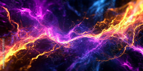 A high-energy, colorful abstract background resembling plasma electricity. The crackling streaks of neon violet, radiant cyan, and fiery gold create an intense, futuristic, and visually electrifying