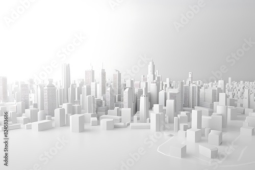 A highly detailed 3D model of a cityscape in pristine white, showcasing buildings, streets, and infrastructure with intricate precision