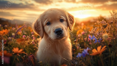 A highly detailed and realistic photo of a golden retriever puppy with big, curious eyes and fluffy fur, standing in a field of wildflowers with a sunset in the background