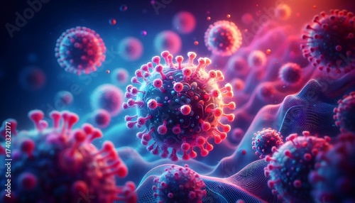 A highly detailed and vibrant depiction of microscopic viruses, featuring numerous spherical particles with spiky protrusions. The viruses float in a surreal, softly blurred blue and purple background