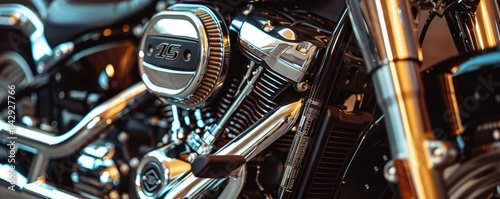 A highly detailed close-up of a chrome motorcycle engine showcasing mechanical complexity.