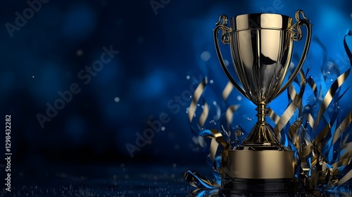 A highly detailed golden trophy shining brightly in the center of a dark blue background symbolizing success achievement and prestigious recognition