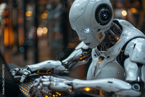 A highly detailed image showcasing a humanoid robot interacting with technology, symbolizing AI and robotics progress