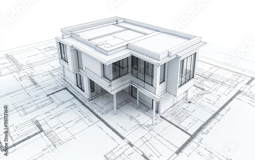 A high-quality 3D render of a minimalist modern two-story house blueprint, featuring bold black lines on a white background