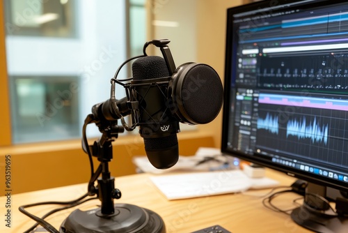 A high-quality podcast studio setup featuring a professional microphone, a computer monitor displaying audio editing software, and a desk with a notepad and pen. The image represents the process of cr