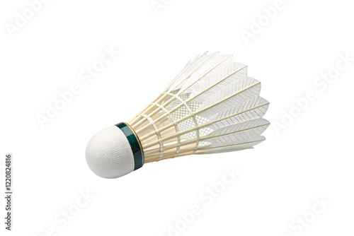 A high-quality shuttlecock with natural feathers and a green band, meticulously crafted for precision and flight consistency. Isolated on a transparent background