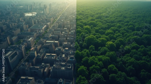 A high-resolution background image contrasting a structured cityscape with chaotic wilderness.