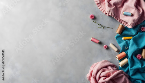 A high-resolution flat lay of colorful sewing threads, buttons, and fabric swatches arranged neatly on a white background. Top-down view, balanced composition, no labels or text. The image focuses on