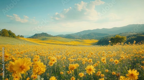 A high-resolution Full HD shot of a vast landscape filled with yellow blossoms of the golden trumpet flower, showcasing the scenic beauty of Thailand's flower fields during peak season.