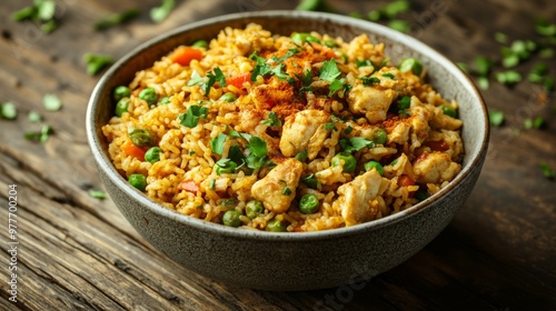 A high-resolution image of a bowl of curry fried rice with visible chunks of chicken, vegetables, and a dusting of curry powder, set against a rustic wooden table.