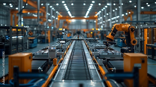 A high-resolution image of a human worker and a collaborative robot (cobot) working together on an assembly line in a modern manufacturing setup.