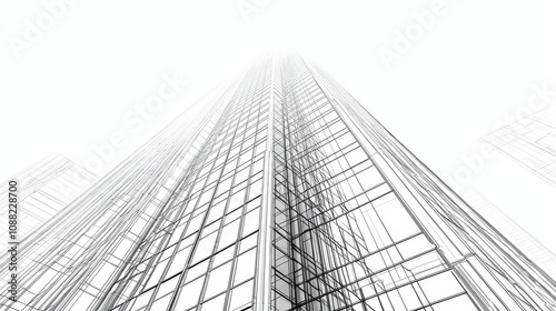 A high-rise building structure is depicted from a low angle, showcasing its skeletal frame against a light backdrop, emphasizing modern architecture.