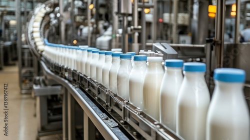 A high-speed dairy production line bottling fresh milk in a factory.