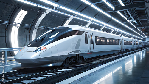 A high-speed magnetic levitation train zooming through a futuristic tunnel, representing efficient and sustainable public transportation with copy space.