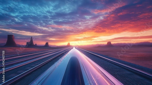A high-speed rail system in the desert, with sleek tracks disappearing into the horizon under a vivid sunset sky