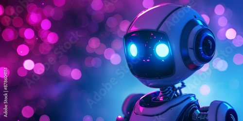 A high-tech AI robot with glowing blue eyes, set against vibrant neon lights. Futuristic and advanced.