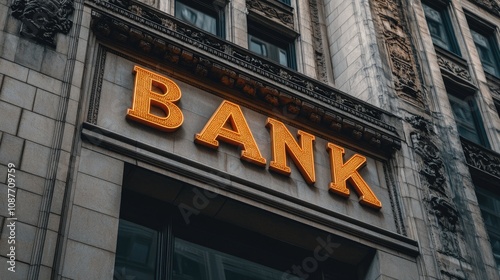 A high-tech BANK sign in glowing letters on a sleek building, framed by futuristic architecture and urban design.