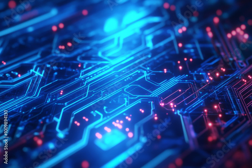 A high-tech blue background highlighted by intricate neon circuit designs and vibrant abstract data flows. The glowing elements convey a sense of depth and complexity, symbolizing the future of