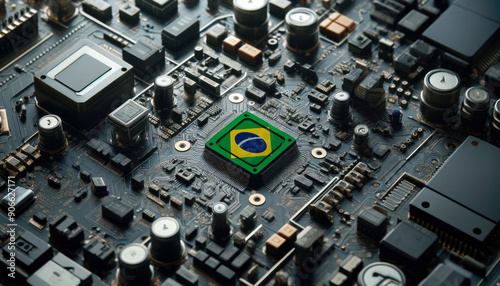A high-tech circuit board showcasing a microchip with the Brazil flag, emphasizing Brazil role in pioneering advanced electronics and microtechnology innovations