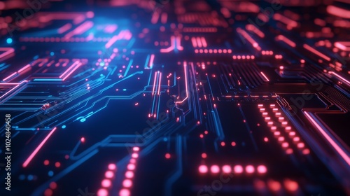 A high-tech circuit board with a glowing blue background and intricate patterns.