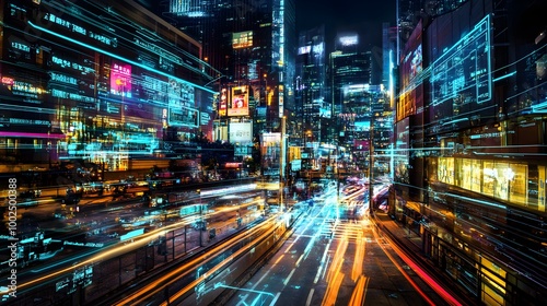 A high-tech city scene with an advanced digital society, where holographic displays project information and advertisements onto buildings, blending modern architecture with artificial intelligence