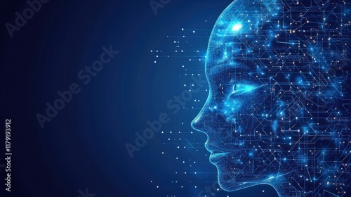 A high-tech concept of an AI-driven digital face with neural network visuals and glowing blue circuits