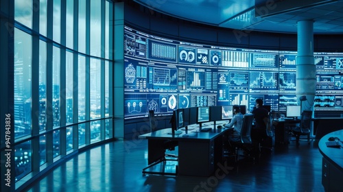 A high-tech control room with large screens displaying various data and graphs, showcasing a futuristic command center.