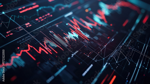 A high-tech dashboard showcases various graphs and charts with smooth glowing edges, arranged on a futuristic interface filled with animated elements and flowing data streams.