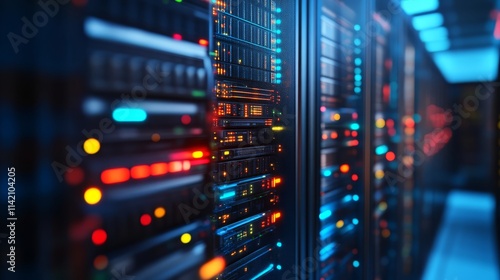 A high-tech data center with illuminated servers showcasing vibrant lights and sleek design, symbolizing advanced technology and data management.