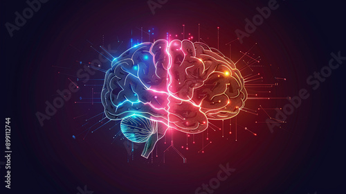 A high-tech digital brain illustration with vibrant blue and red glowing lines, highlighting neural pathways. This futuristic image symbolizes advanced artificial intelligence and neural connectivity.