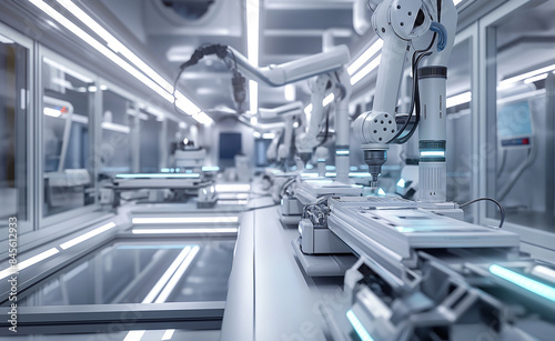 A high-tech factory with robotic arms working on assembly lines, illustrating automation and advanced manufacturing.