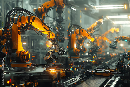 A high-tech factory with robots on an assembly line, manufacturing car body parts efficiently.