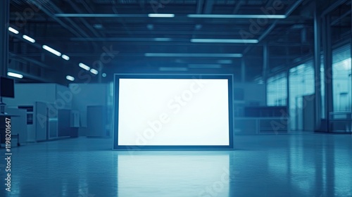 A high-tech interactive display in a corporate space, with a bright empty touchscreen interface.