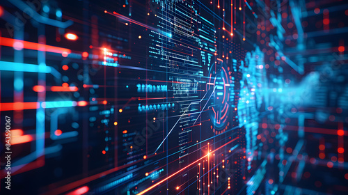 A high-tech interface showing a cybersecurity network, network, dynamic and dramatic compositions, with copy space