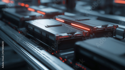 A high-tech manufacturing line featuring advanced battery modules with glowing red accents, symbolizing innovation in energy storage and modern technology.